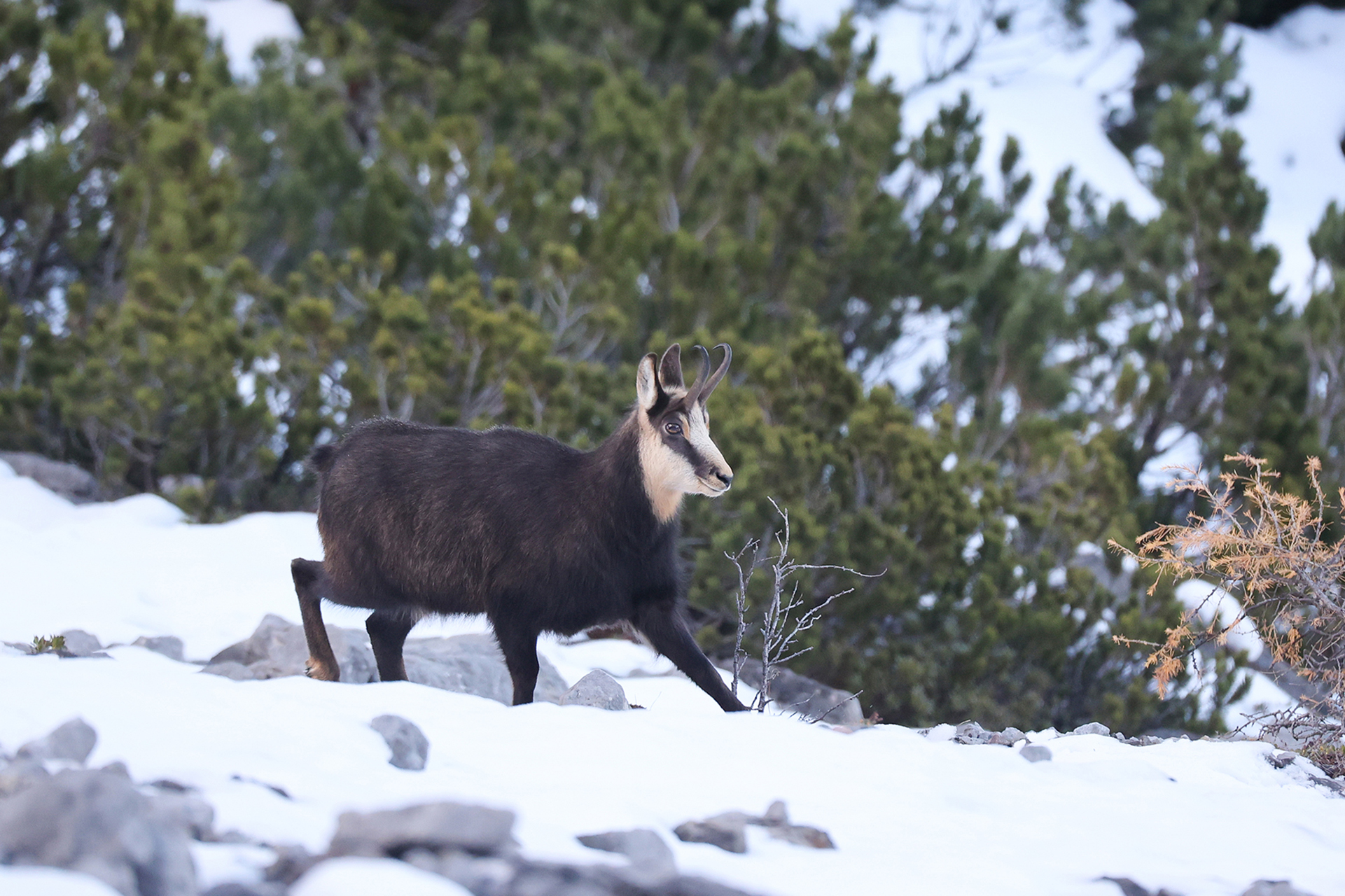 alte Gamsgais mit derbem Haupt, mit breitem Windfang und ergrauenden Zügeln sowie durchhängender Bauchlinie
